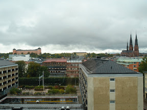 Vi inledde hur som helst med att gå på föreläsning i Uppsala Konsert och Kongress där Johnny Svendborg, arkitekten bakom huset, skulle beskriva processen från första tanke till färdigt hus. Det var en i mångt och mycket intressant föreläsning på en timma där vi fick höra hur grundtanken (att koppla samman "nya" och "gamla" Uppsala genom ett hus man kunde se igenom) utvecklades till ett färdigt hus och hur man löste de problem som uppstod under vägen. Vi tog oss efter föreläsningen upp till "observationsdäck" och tog en bild över utsikten mot Carolina.
